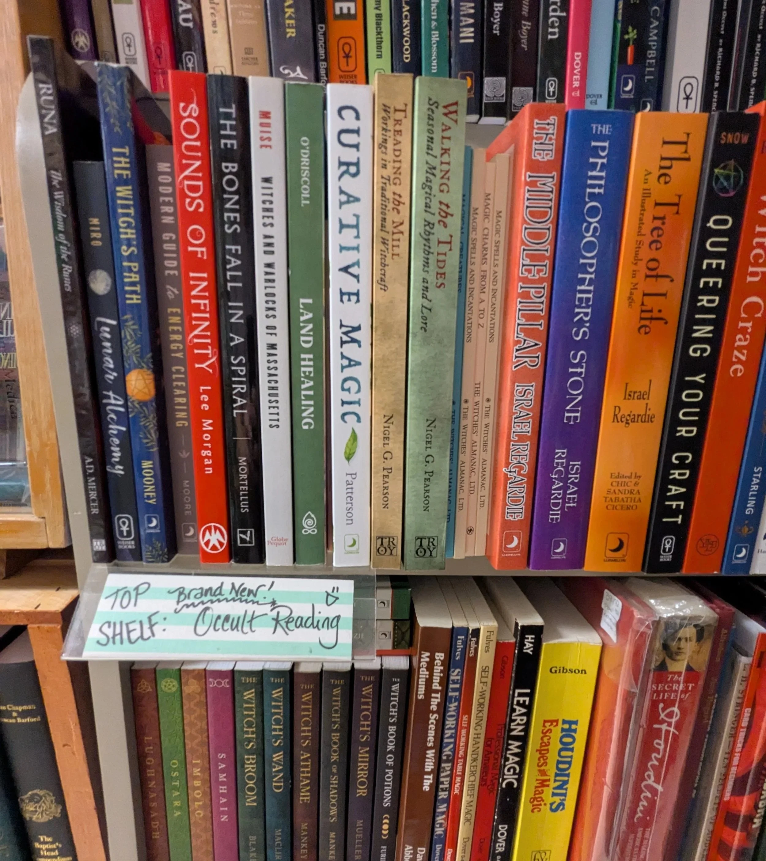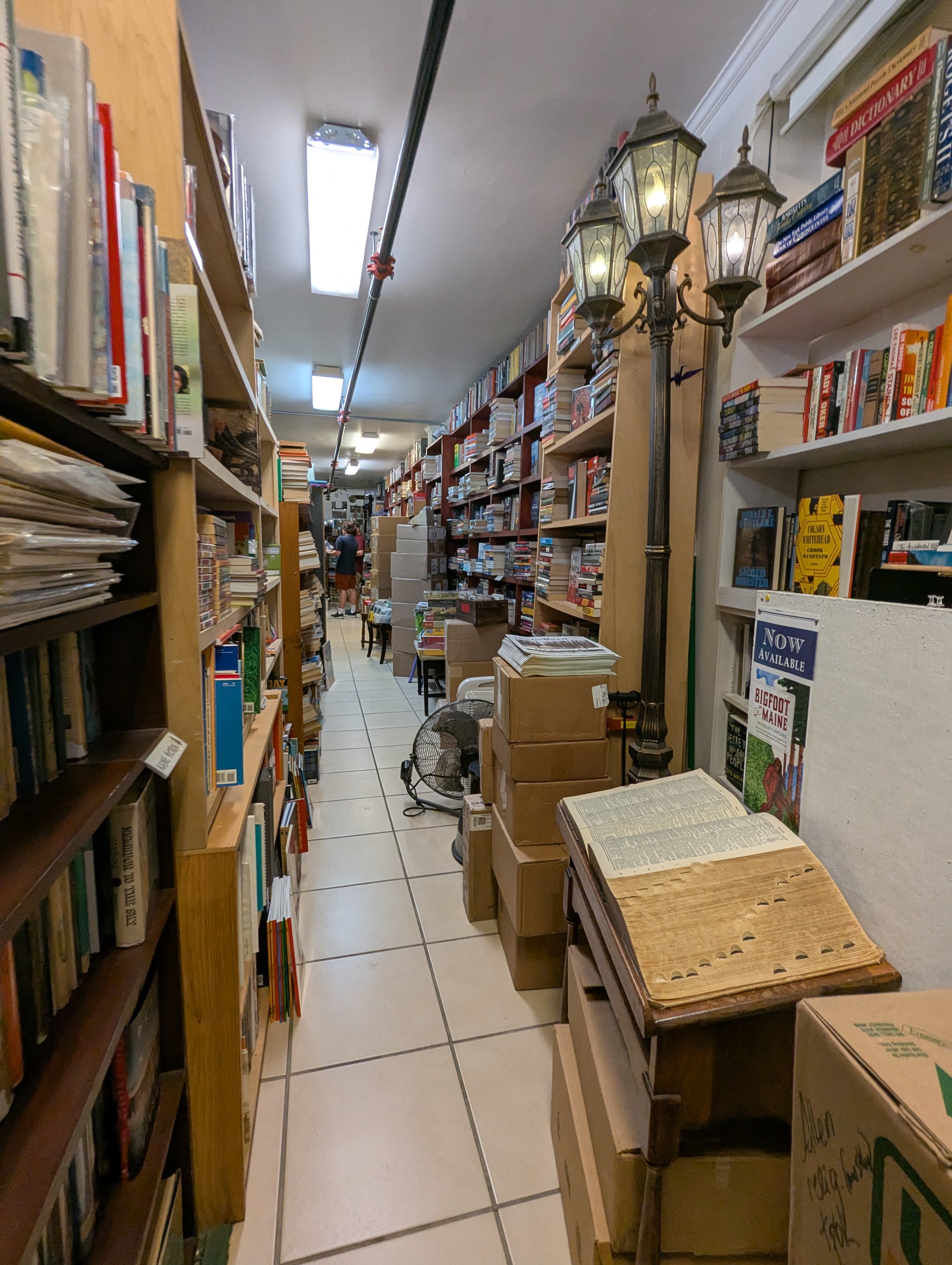 With a logo straight from the noir pulps of yore, a big green hand greets you as you enter this magnificent shop. Long rows extend to the rear, each one stuffed with books and nooks covering all the genres and categories imaginable, but the ones that stood out to my particular interests included the copious amounts of pulp, potboilers, noir, mystery, sci-fi, horror, westerns, poetry, classic lit with cool older cover art you just can’t find anymore, spooky stuff, and the strange/occult titles that are sometimes protected with plastic sheeting and sometimes available to thumb through, the mass-market spines gently worn in ways that feel good in your hands. But there are plenty of newer books too, all manner of mainstream literary, recent topical non-fiction, historical explorations, memoirs and biographies, and yes, more and more occult specialties as I moved toward the rear. It was a cool, unique catalogue of titles.